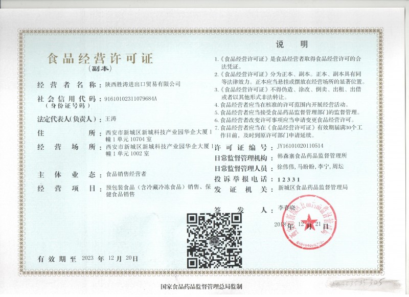 | 發(fā)證機(jī)構(gòu): | 西安市新城區(qū)食品藥品監(jiān)督管理局 | 發(fā)證時間 : | 2018-12-21 |